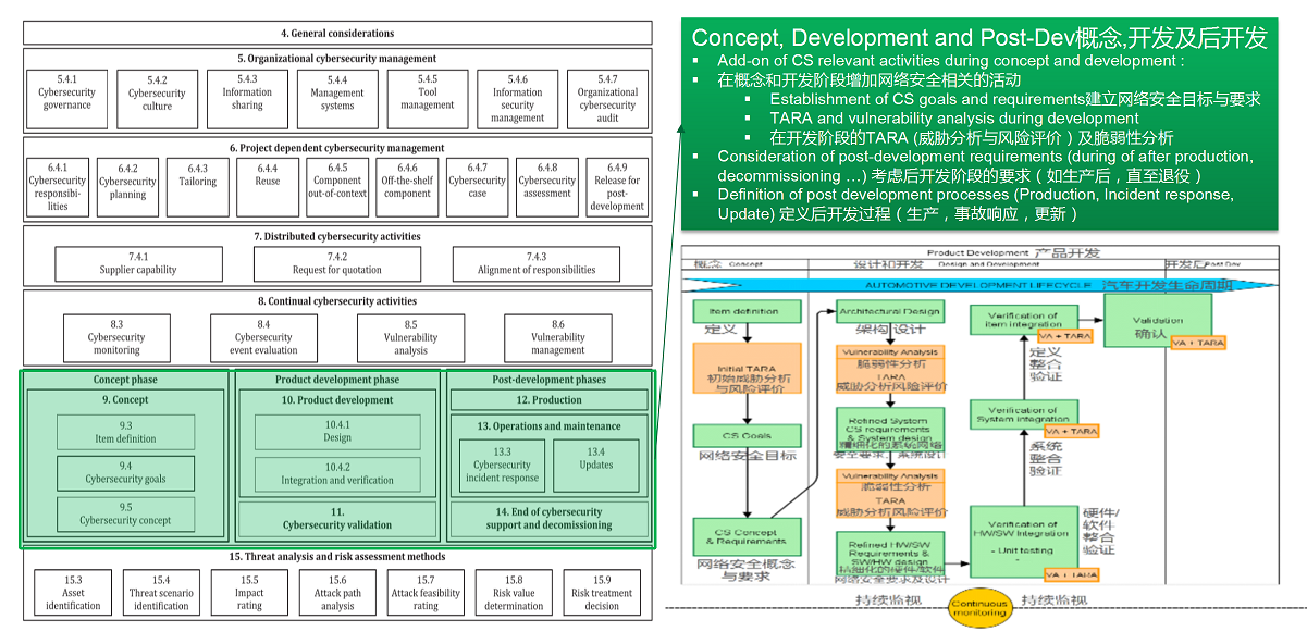 第9-14章 描述了从概念设计到产品开发、验证、生产及后期运维和退役全生命周期的网络安全活动和相关要求。