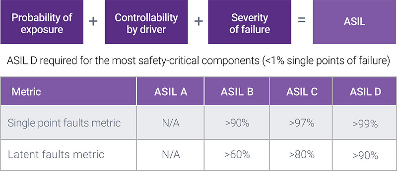 ISO 26262根据严重度(Severity)、暴露率(Exposure)和可控性(Controllability),给汽车上的全部电子电气系统划分安全等级,安全气囊、防抱死制动系统和动力转向系统必须达到ASIL D级,这是应用于安全保障的最严苛等级,因为其失效带来的风险最高。而安全等级范围的最低等级,如后灯等部件,仅需达到ASIL A级即可。大灯和刹车灯通常是ASIL B级,而巡航控制通常是ASIL C级。